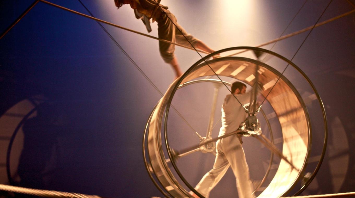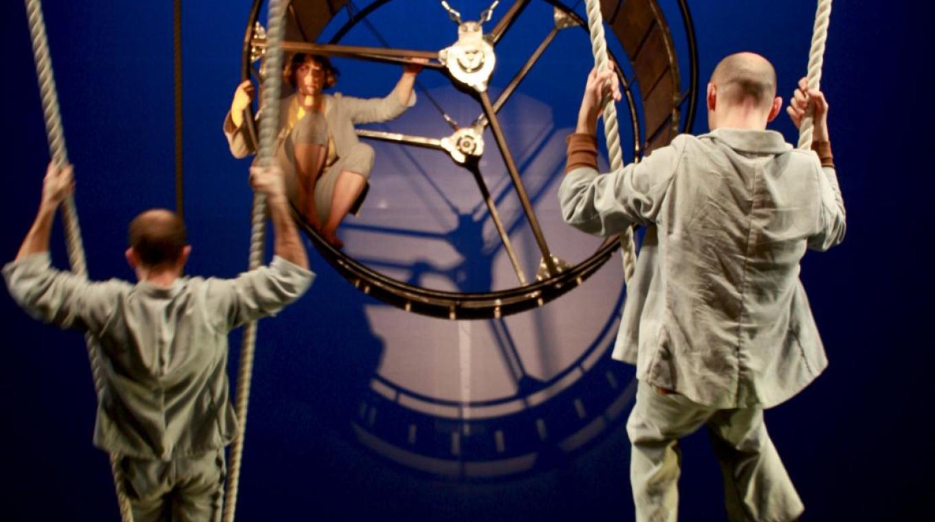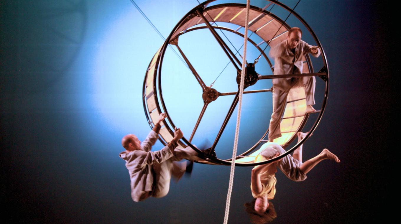 Ockham’s Razor create daring physical theatre on specially created aerial equipment. In The Mill, a large wheel made of wood and steel is suspended from a 7-metre high rig, linked into a system of ropes and wooden drums to create an intricate set. Powered by the performers using all their strength and weight, they create a precarious world where small decisions or actions gather momentum and impetus beyond their control.