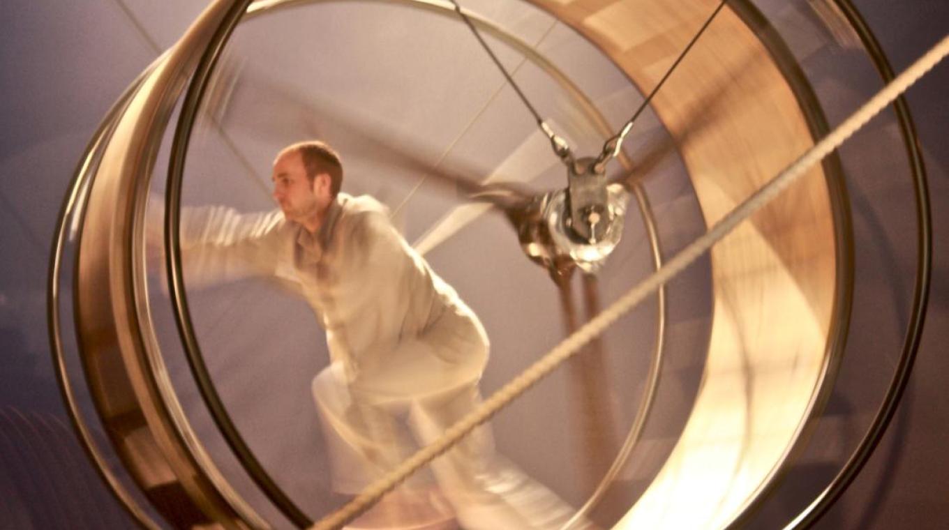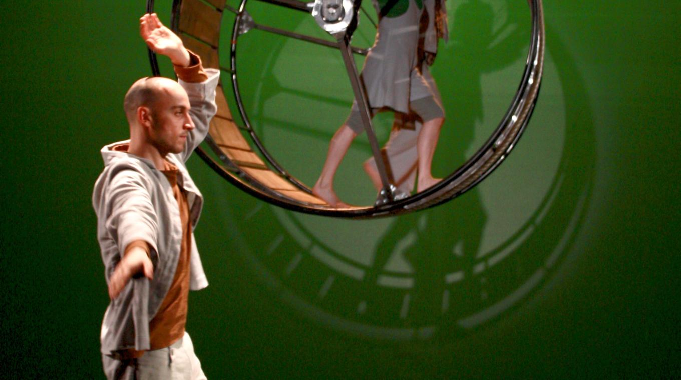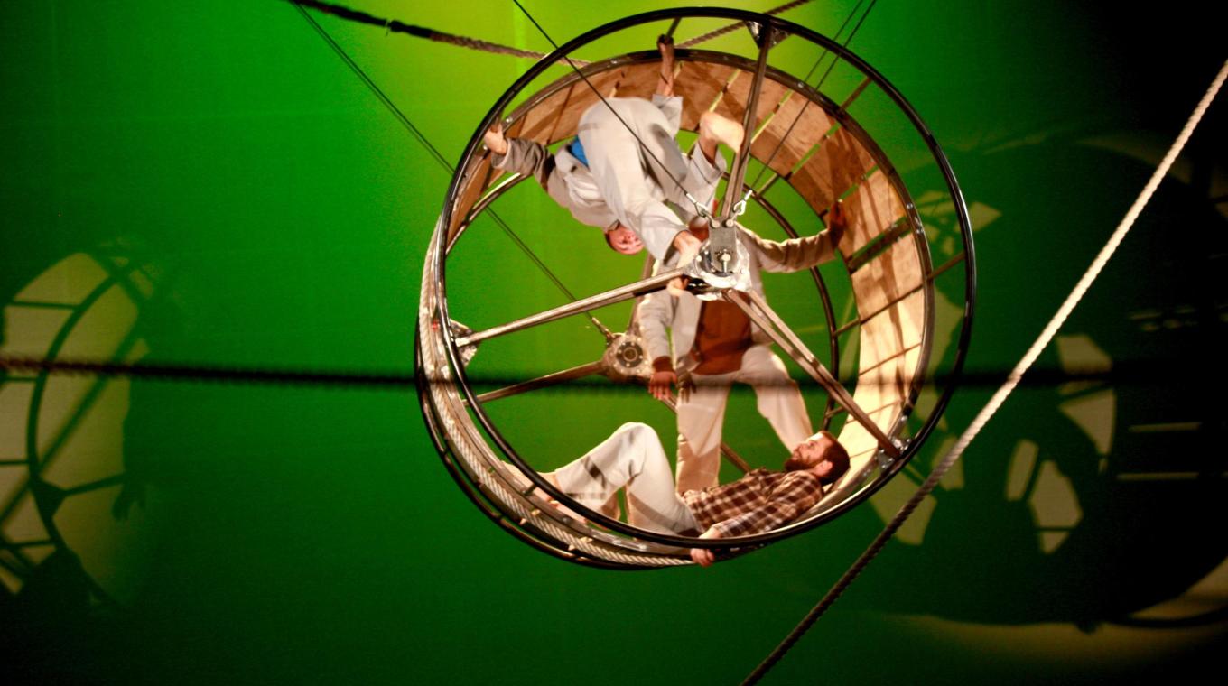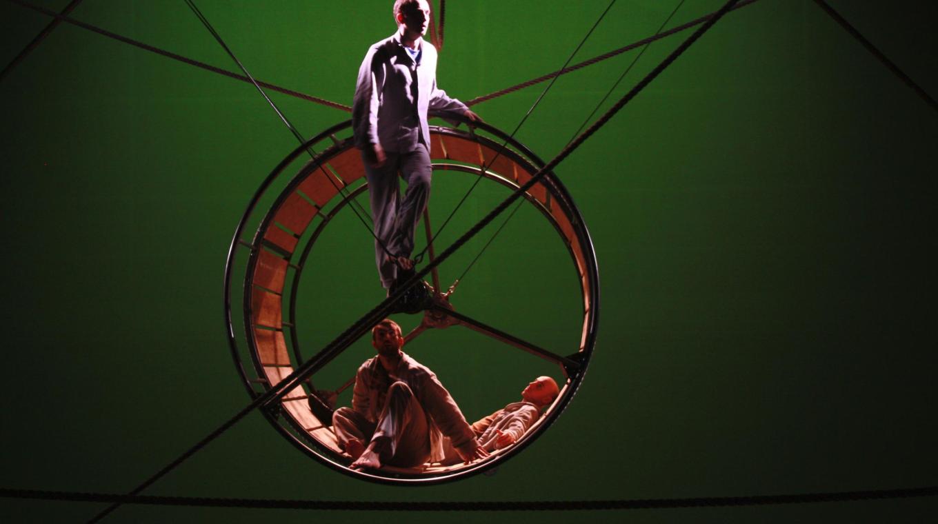 Ockham’s Razor create daring physical theatre on specially created aerial equipment. In The Mill, a large wheel made of wood and steel is suspended from a 7-metre high rig, linked into a system of ropes and wooden drums to create an intricate set. Powered by the performers using all their strength and weight, they create a precarious world where small decisions or actions gather momentum and impetus beyond their control.